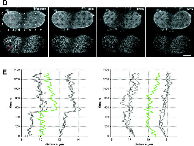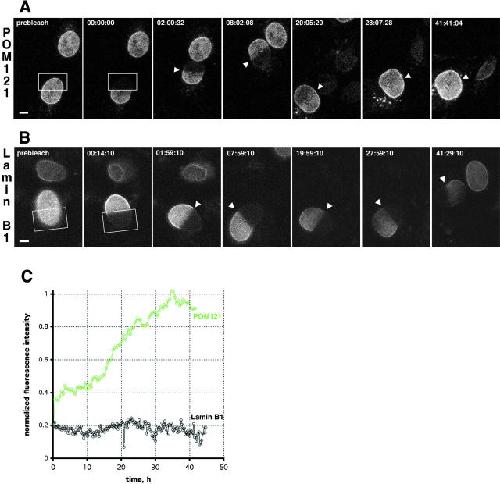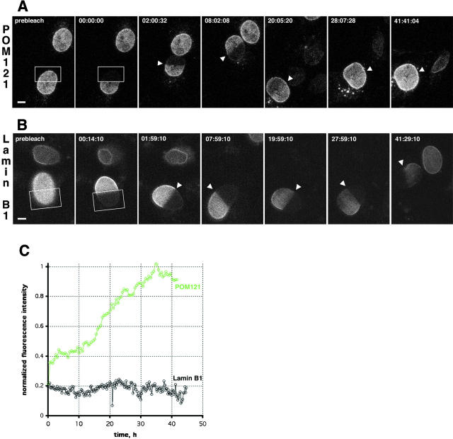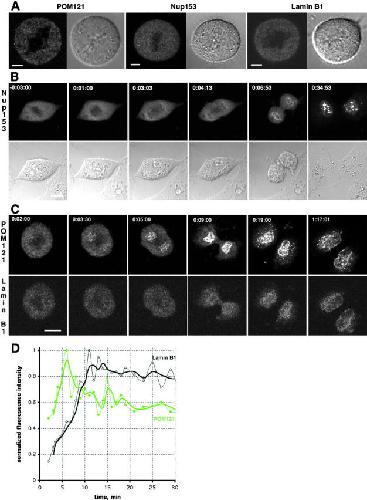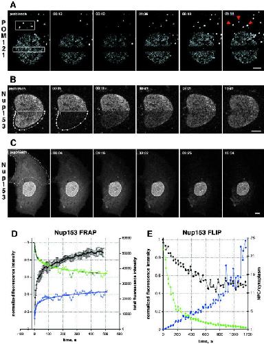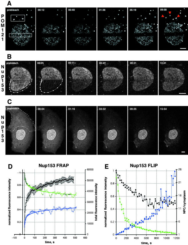 The nuclear pore complex (NPC) and its relationship to the nuclear envelope (NE) was characterized in living cells using POM121-green fluorescent protein (GFP) and GFP-Nup153, and GFP-lamin B1. No independent movement of single pore complexes was found within the plane of the NE in interphase. Only large arrays of NPCs moved slowly and synchronously during global changes in nuclear shape, strongly suggesting mechanical connections which form an NPC network. The nuclear lamina exhibited identical movements. NPC turnover measured by fluorescence recovery after photobleaching of POM121 was less than once per cell cycle. Nup153 association with NPCs was dynamic and turnover of this nucleoporin was three orders of magnitude faster. Overexpression of both nucleoporins induced the formation of annulate lamellae (AL) in the endoplasmic reticulum (ER). Turnover of AL pore complexes was much higher than in the NE (once every 2.5 min). During mitosis, POM121 and Nup153 were completely dispersed and mobile in the ER (POM121) or cytosol (Nup153) in metaphase, and rapidly redistributed to an immobilized pool around chromatin in late anaphase. Assembly and immobilization of both nucleoporins occurred before detectable recruitment of lamin B1, which is thus unlikely to mediate initiation of NPC assembly at the end of mitosis.