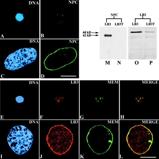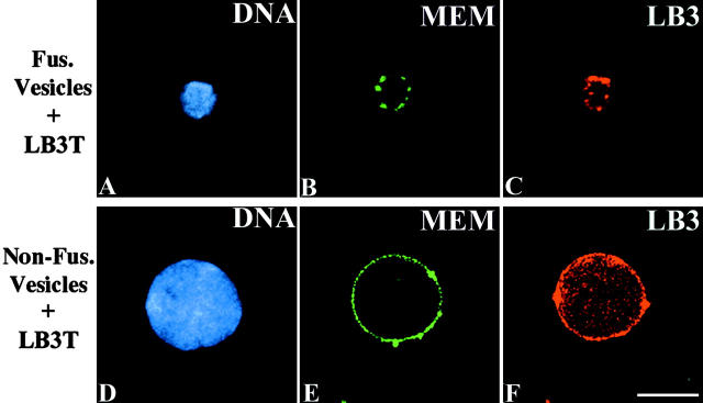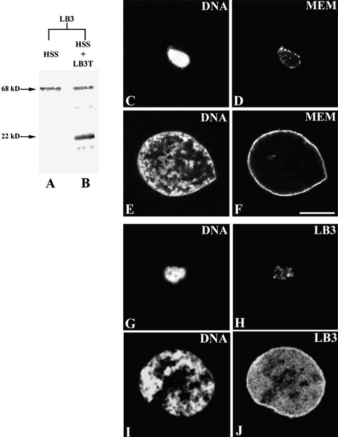 The molecular interactions responsible for nuclear envelope assembly after mitosis are not well understood. In this study, we demonstrate that a peptide consisting of the COOH-terminal domain of Xenopus lamin B3 (LB3T) prevents nuclear envelope assembly in Xenopus interphase extracts. Specifically, LB3T inhibits chromatin decondensation and blocks the formation of both the nuclear lamina-pore complex and nuclear membranes. Under these conditions, some vesicles bind to the peripheral regions of the chromatin. These "nonfusogenic" vesicles lack lamin B3 (LB3) and do not bind LB3T; however, "fusogenic" vesicles containing LB3 can bind LB3T, which blocks their association with chromatin and, subsequently, nuclear membrane assembly. LB3T also binds to chromatin in the absence of interphase extract, but only in the presence of purified LB3. Additionally, we show that LB3T inhibits normal lamin polymerization in vitro. These findings suggest that lamin polymerization is required for both chromatin decondensation and the binding of nuclear membrane precursors during the early stages of normal nuclear envelope assembly.