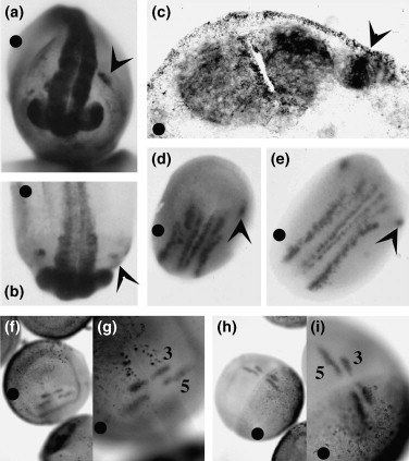 Figure 3. Overexpression of ADAM 13 does not affect central nervous-system formation. Whole-mount in situ hybridization of embryos expressing (a,c,d) wild-type ADAM 13 or (b,e) the E/A mutant constructs were processed with (a) the pan-neural marker Xsox-2 and (d,e) the neuronal marker N-tubulin. Black dots indicate the transcript-injected half of each embryo. Embryos expressing wild-type ADAM 13 lack Xsox-2-positive cells in the vicinity of the otic vesicle; (a) such cells are present in the E/A and noninjected control halves of each embryo (arrowheads). (c) Transverse section at the level of the putative otic vesicle of an embryo in a stage similar to that in (a). Dorsal views of both (d) wild-type and (e) E/A-expressing embryos at the early-neurula stage (stage 15). (d,e) Lateral expression of N-tubulin within the putative trigeminal ganglion (black arrowheads) is absent from (d) the wild-type-injected side. (f) Dorsal views of neurula-stage (stage 19) embryos overexpressing (f,g) wild-type or (h,i) E/A ADAM 13 and hybridized with the Xkrox-20 probe. The localization of Xkrox-20 in rhombomeres 3 and 5 is identical in the uninjected control side compared to the injected side of each embryo