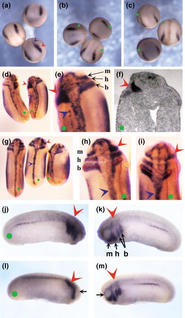 Figure 2. Overexpression of ADAM 13 alters neural crest-cell positioning in vivo. Embryos were injected into the animal pole of one blastomere at the two-cell stage with (b,d,j,k) 1 ng wild-type ADAM 13, (c,g,h,l,m) the E/A point mutant, or (i) the E/AδCyto transcripts. Injected embryos were cultured to (a) early-neurula stage 13 or (d) tailbud stages and processed for (a) Xslug mRNA expression (blue), (j) Xtwist, and the Myc-tag epitope (light brown). The green dot indicates the injected side of each embryo; red and blue arrowheads indicate the cranial and trunk crests, respectively. Dorsal views of (a) noninjected control embryos, (b) wild-type embryos, or (c) E/A mutants at stage 13 show no difference in the Xslug expression pattern. (d) Dorsal views of wild-type transcript-injected stage 25 (left) and 22 (right) embryos. (e) A higher-magnification view of the stage 22 embryo in (d) shows that the three cranial-crest segments visible on the control side (mandibular, m; hyoid, h; and branchial, b) appear as a single mass on the injected side (red arrowhead). (d,e) Islands of ectopic Xslug- positive trunk crest cells (blue arrowheads) are also noted in the flank on the injected side. (f) A horizontal section of a stage 24/25 embryo confirms the location of the cranial crest expressing Xslug on the injected side. Xslug expression in the head is weak at this stage, as seen in the noninjected control side (e.g., stage 25 embryo on the left in [d]). (g) Dorsal views of tailbud embryos (stage 24, left; stage 22, right) expressing the E/A point mutant. The pattern and position of the trunk crest is normal, although subtle differences in the cranial crest are observed; (h) the extent of migration of cranial crest segments on the injected side is decreased relative to that of the control side (red arrows). (i) Stronger defects are observed in embryos overexpressing the E/AδCyto protein. (j) Lateral views of tailbud stage embryos injected with wild-type ADAM 13 (j,k) or the E/A mutant (l,m). Injected embryos were stained with the cranial neural crest-cell marker Xtwist. As seen with Xslug, the cranial-crest segments of the embryo injected with wild-type ADAM 13 are not as clearly defined as those in the contra-lateral noninjected side (compare [j] and [k]). Interestingly, overexpression of the E/A ADAM 13 (compare [l] and [m]) has dramatically reduced the migration of cells from the hyoid and branchial crest segments (red arrowhead)