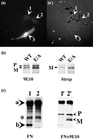 Figure 7. The E/A ADAM 13 inhibits endogenous ADAM 13 remodeling of fibronectin. Xenopus XTC cells were plated on fluorescent fibronectin for 24 hr prior to fixation. (a) Cells expressing the E/A ADAM 13 were detected with the 9E10 mAb. Fields containing both transfected (arrowhead 3) and nontransfected (arrowheads 1 and 2) cells were selected. The fluorescent fibronectin substrate within the same field is presented in (a′). (a′) During this longer period of incubation (24 hr), nontransfected cells remodeled the substrate (arrowheads 1 and 2), while the cell expressing the E/A ADAM 13 did not (arrowhead 3). (b) Surface-biotinylated XTC cells transfected with either wild-type or E/A ADAM 13 were extracted and immunoprecipitated with mAb 9E10. Immunoprecipitated proteins were separated by SDS-PAGE and transferred to nitrocellulose. Blots were either incubated in mAb 9E10 for the detection of total ADAM 13 protein (left panel) or in streptavidin-HRP for the identification of ADAM 13 at the cell surface (right panel). In each case only the mature form (M) of wild-type ADAM 13 or the E/A mutant is present at the cell surface. (c) Embryos overexpressing wild-type ADAM 13 were extracted in the presence of BB-3103. Immunoprecipitated wild-type ADAM 13 was incubated with immunoprecipitated fibronectin in the absence (lane 1) or the presence (lane 2) of 0.5 mM BB-3103 for 1 hr at 20. The immunoprecipitated fibronectin was analyzed by a Western blot with the 4H2 mAb (left panel). The same blot was then probed with mAb 9E10 for the detection of wild-type ADAM 13 (right panel). The mature (M) form of ADAM 13 is only seen in lane 2′, and this observation confirms the efficiency of the BB-3103 inhibitor in these experiments. The arrowheads in the left panel of (c) point to intact fibronectin (arrowhead a) or the major specific degradation product (arrowhead b, 90 kDa). The asterisk points to a 120 kDa fibronectin fragment, the formation of which is independent of ADAM 13