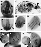 Figure 4. CNC grafts. Transcripts encoding GFP (0.3 ng) alone or in combination with wild-type (0.7 ng) or E/A (0.7 ng) ADAM 13 were injected in one blastomere of two-cell-stage embryos. Labeled cranial neural-crest explants were taken from stage 17/18 Xenopus embryos and grafted into unlabeled sibling embryos at the same position (CNC was removed from the host at this position). Lateral views of tailbud stage (stage 24) grafted embryos, with (a) bright field images on the left and (aâ²â²) fluorescent images on the right. (a,aâ²) Embryos that were grafted with cranial-neural crest that expressed both GFP and wild-type ADAM 13 were indistinguishable from (not shown) embryos grafted with CNC expressing GFP alone. (aâ²) Fluorescent neural-crest cells migrate along pathways normally used by CNC streams (m, mandibular; h, hyoid; ba, branchial anterior; bp, branchial posterior). (b) In contrast, cranial neural-crest cells expressing both the E/A ADAM 13 mutant and GFP (bâ²) do not migrate or (câ²) only migrate in the mandibular segment. The cement gland (dotted line) and (e) the future eye are used in each embryo as reference points for the evaluation of neural crest-cell position and the extent of migration