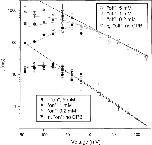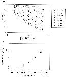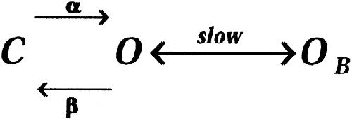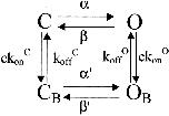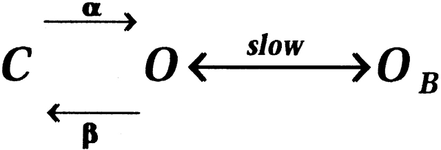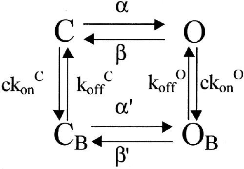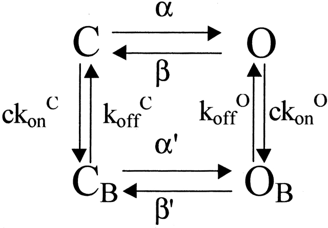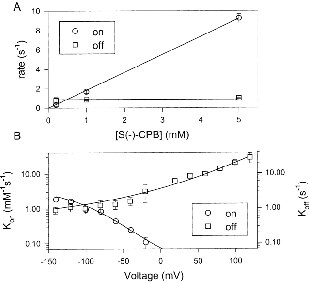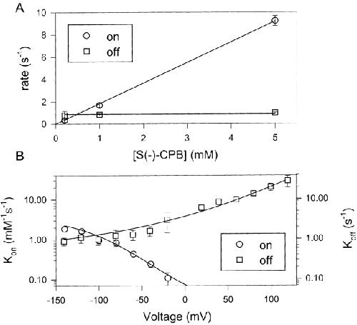 Figure 11. Kinetics of CPB association (on) and dissociation (off). The apparent rates of association, ron, and dissociation, roff, were calculated from the steady-state unbound probability, pU, and from the slow time constants of current relaxations, τs, using . (A) Plots of mean values of ron and roff at −140 mV as a function of the CPB concentration, c; the straight lines are fits with roff = koff = 0.88 s−1 and ron = c · kon = c · 1.84 mM−1 s−1. (B) The apparent second order association rate constant, kon, and first order dissociation rate constant, koff, estimated as shown in A are plotted as a function of voltage (open symbols); For positive voltages, only koff could be obtained as pU is close to unity; the solid lines in B were obtained by the simulation with Fig. 4 (see materials and methods).