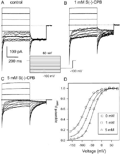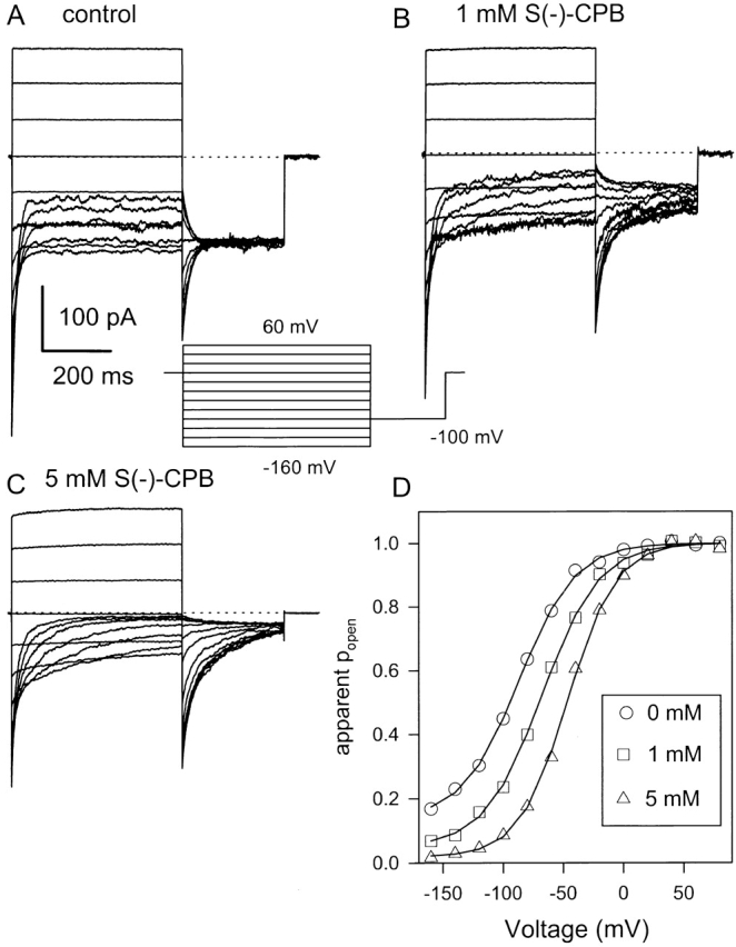 Figure 1. Qualitative effects of S(−)-CPB on the ClC-0 mutant C212S. (A–C) Family of voltage clamp traces recorded from one inside-out patch expressing the point mutant C212S of ClC-0. Currents were elicited using the pulse protocol shown in the inset. The concentration of intracellularly applied S(−)-CPB is indicated. (D) The apparent open probability (symbols) obtained from the initial current at the −100 mV tail pulse (see materials and methods) together with fits of to the data (solid lines).