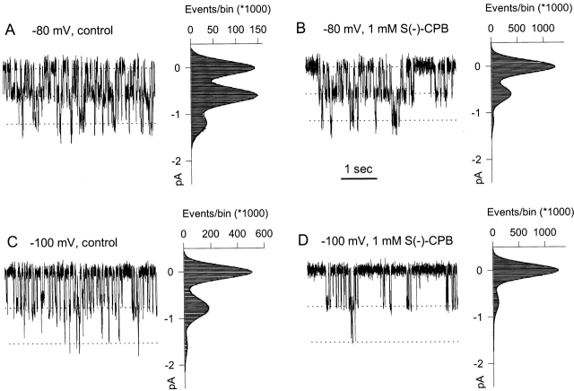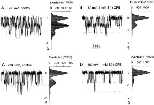 Figure 2. Inhibition of single protopores. A single C212S channel present in an inside-out patch was measured at a holding potential of −80 mV (top traces) and −100 mV (bottom traces) in the absence (left traces) and presence (right traces) of 1 mM S(−)-CPB. Only short stretches (4.3 s) of longer recording periods (>60 s for the recordings in the presence of CPB) are show for each condition. Next to each trace is shown (on the same current scale as the current trace) an amplitude histogram of the complete recording together with a fit of the sum of three Gaussian components. The peaks of the Gaussian fits are indicated as dashed lines on the current traces. The respective area of each Gaussian component was used to calculate the relative open probability of each conductance state (see Saviane et al. 1999) plotted in Fig. 3. Solutions are given in materials and methods. Traces were filtered at 1 kHz for the analysis.