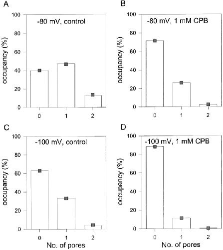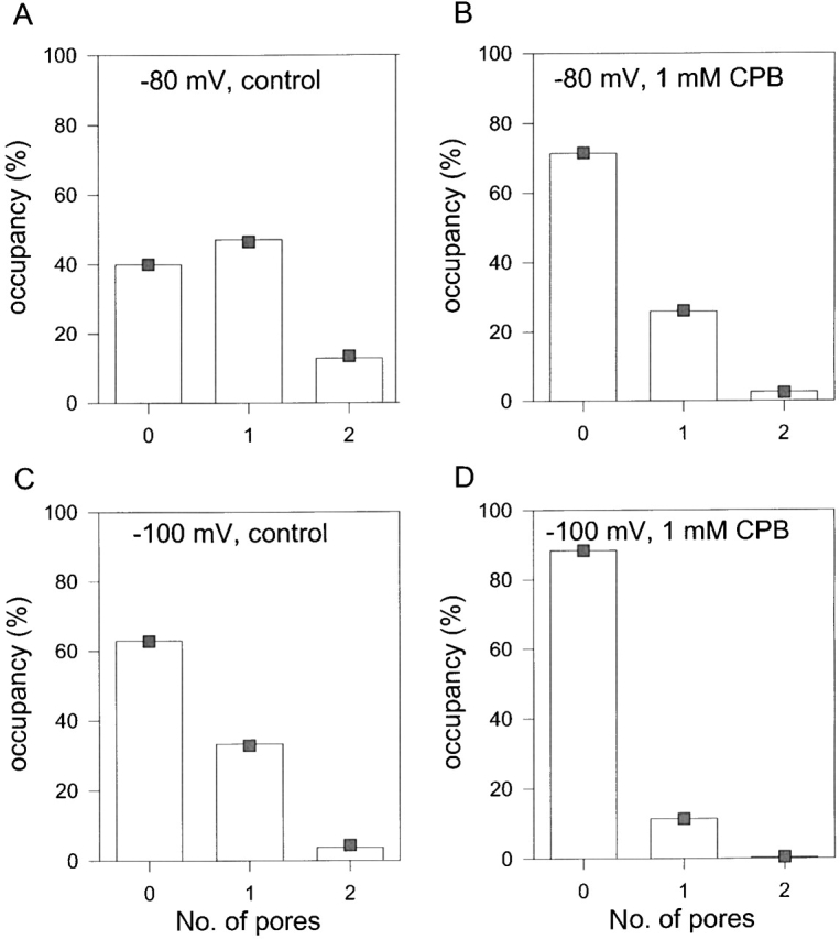 Figure 3. Binomial analysis of the single pore block. The occupancy of each of the three conductance levels (0, 1 “pore” open, 2 “pores” open) obtained from the Gaussian fits of Fig. 2 are plotted as bars for each of the four conditions of Fig. 2 ([A] V =−80mV, no CPB; [B] V =−80 mV, 1 mM S(−)-CPB; [C] −100 mV, no CPB; [D] −100 mV, 1 mM S(−)-CPB). The squares in each graph indicate the best fit assuming an independent gating of two identical protopores according to ([A] p = 0.37; [B] p = 0.15; [C] p = 0.21; [D] p = 0.06). Mean values (n ≥ 3, ±SD) were as follows: for −80 mV, 0 CPB, p = 0.41 ± 0.03; for −80 mV, 1 mM CPB, p = 0.19 ± 0.03; for −100 mV, 0 CPB: p = 0.25 ± 0.03; for −100 mV, 1 mM CPB, p = 0.09 ± 0.02; for −120 mV, 0 CPB, p = 0.18 ± 0.01; and for −120 mV, 1 mM CPB, p = 0.05 ± 0.01.