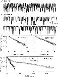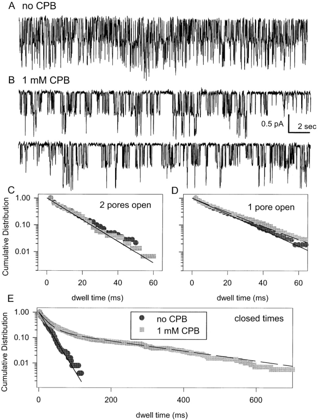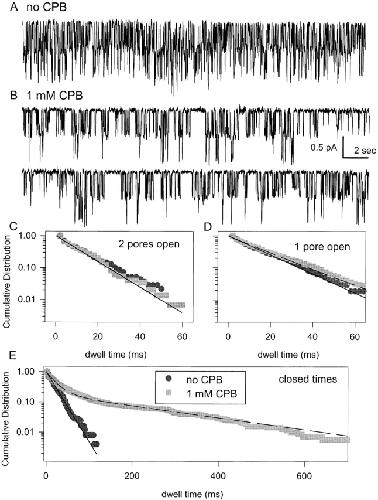 Figure 4. Kinetic analysis of a single channel at −80 mV. The long recordings shown in A (control) and B (with 1 mM CPB in the bath solution; from the same patch) were subjected to idealization after filtering at 500 Hz as described by Saviane et al. 1999. Traces were filtered at 50 Hz for display. Dwell times of the three conductance levels were fitted with a maximum likelihood procedure (Saviane et al. 1999). In the absence of CPB dwell times (C–E, circles) could be well fitted with single exponential functions (double open levels, [C] τ2 = 10.8 ms; single open levels, [D] τ1 = 14.6 ms; closed times, [E] τ0 = 18.8 ms; see solid lines). In the presence of CPB, the dwell distribution of the double open conductance level (C, squares) could be well fitted with a single exponential with the same time constant as in the absence of CPB. The dwell time distribution of the single conductance level in the presence of CPB (D, squares) was much better described by the sum of two exponential functions that were fixed at 14.6 and 23 ms, respectively, as described in Kinetic Analysis of Single Channels. The distribution of zero current epochs (E, squares) was fitted with the sum of three exponential functions (E, dashed line) where two of the time constants were fixed to 18.8 and 37.6 ms, respectively, as described in the text and a larger time constant was determined by the fit to 220 ms. Qualitatively similar results were obtained in two patches at −80, −100, and −120 mV.