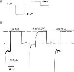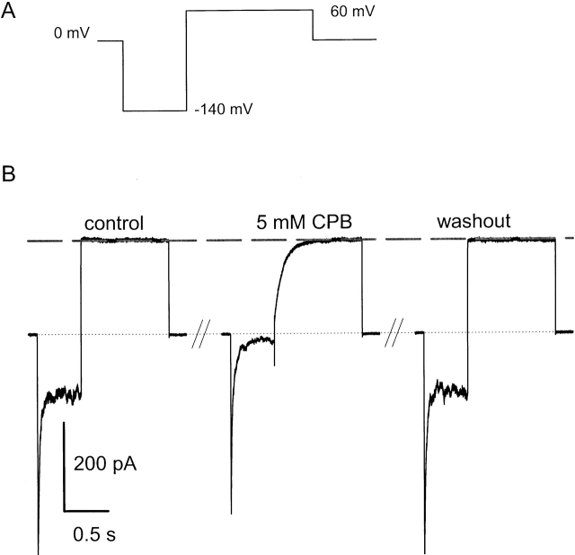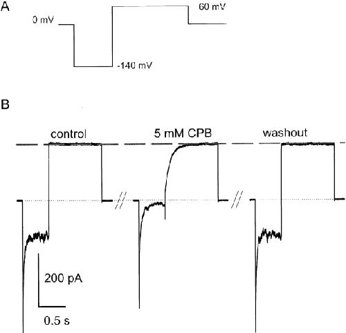 Figure 5. Complete unblock at positive voltages. To test if mutant C212S is slightly blocked by S(−)-CPB at positive voltages, a test pulse of the form shown in A was applied every 3 s. The intracellular solution of the inside-out patch was repeatedly switched between CPB-free and 5 mM S(−)-CPB containing solution. (B) The current responses after consecutive solution changes. The dashed line indicates the steady-state current level at 60 mV under all conditions. Clearly, the relief from inhibition at this voltage is practically complete. The dotted line indicates the zero current level.