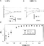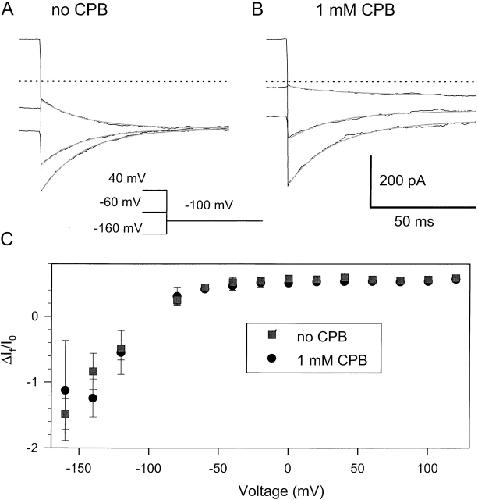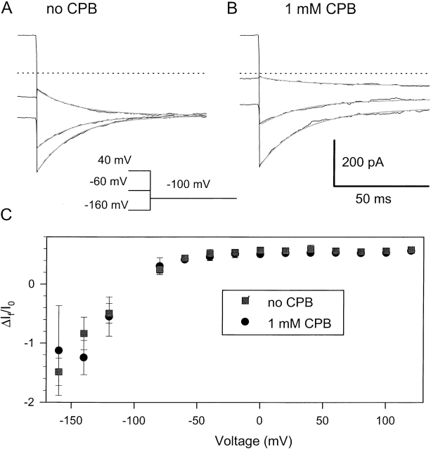 Figure 6. CPB-bound protopores do not contribute to steady-state conductances. The fast component of tail currents at −100 mV is used to identify the fraction of open pores that are drug-free at the end of a conditioning prepulse. Tail currents after prepulses of 700 ms duration to various voltages (traces are shown for −160, −60, and +40 mV) in the absence (A) and after addition of 1 mM CPB to the intracellular solution (B). The smooth lines in A are fits with single exponentials with the same time constant τf = 19.5 ms. The smooth lines in B are fits with double exponentials, comprising a fast component with the same time constant, τf = 19.5 ms, and a slower one, τs = 253 ms, equally independent of the prepulse. (C) The ratio ΔIf/I0 of the amplitude of the fast exponential relaxation, ΔIf, to that of the initial current, I0, is plotted as a function of the prepulse voltage, both for CPB-free conditions (squares) and for 1 mM CPB (circles). (mean values ± SD, n = 4).