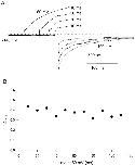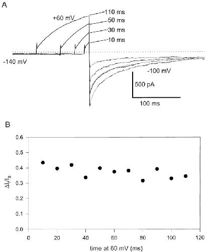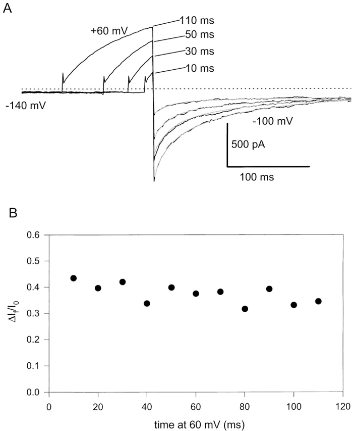 Figure 7. CPB-bound protopores are not conductive during recovery from inhibition. C212S channels in a patch exposed to 5 mM CPB were first maximally inhibited by a step to −140 mV for 2 s, the brought to +60 mV for variable times, Tp, and finally brought to −100 mV. The records shown in A, obtained for Tp = 10, 30, 50, and 110 ms, show a progressive decrease of the initial inhibition. However, the tail relaxation is in all cases a double exponential (smooth lines) with the same fast and slow time constants. (B) Plot of the relative amplitude of the fast relaxation, ΔIf/I0, as a function of Tp; at all times during the removal of inhibition all conducting pores undergo fast relaxations as in the absence of CPB.