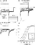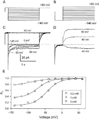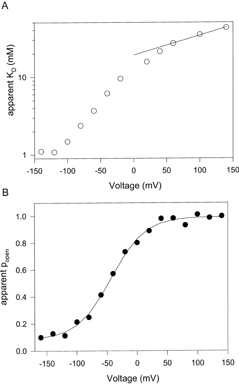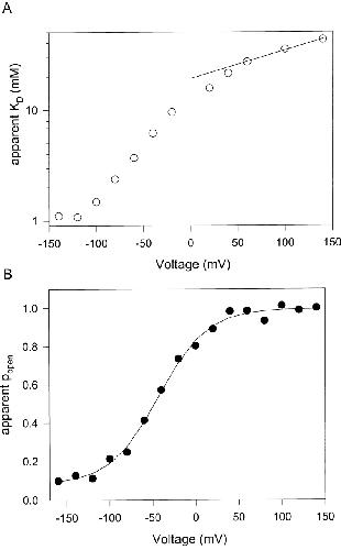 Figure 15. Voltage dependence of the block of mutant K519E. (A) From the mean values of the ratio of the steady-state current in presence and absence of CPB, I(CPB)/I(0), for CPB concentrations of 1, 5, and 10 mM the apparent dissociation constant, Kd, was obtained by a fit with for voltages ranging from −140 to +140 mV. The resulting Kd values are plotted as a function of voltage. The straight line represents a fit of a simple exponential function of the points at 60, 100, and 140 mV. It has a slope corresponding to an apparent electrical distance of 0.15. (B) Apparent open probability of the fast gate of the mutant K519E in the presence of 5 mM CPB. After long saturating pulse to voltages between −140 and +140 mV, the currents recorded at the beginning of a pulse to −140 mV were normalized and plotted as a function of the prepulse voltage. The solid line is the Boltzmann fit obtained with using parameters pmin = 0.085; V1/2 = −43.0 mV, and z = 0.90.