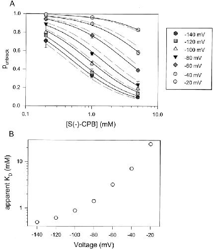 Figure 9. Steady-state binding of CPB to C212S protochannels. (A) Mean values of pU are plotted versus the concentration of S(−)-CPB for the voltages indicated in the figure (n ≥ 4 patches for each data point; error bars indicate SD). The solid lines are fits of with the apparent dissociation constant, Kd, as free parameter at each voltage. The resulting Kd values are plotted in B as a function of voltage. The dashed lines were obtained from the simulation of Fig. 4 with the parameters given in Table .