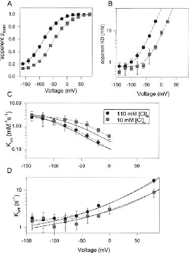 Figure 12. Effect of [Cl]e on the block. [Cl]e was changed from 110 mM (standard solution) to 10 mM (Cl− was replaced by glutamate) on outside-out patches with no or with 5 mM S(−)-CPB present in the intracellular (pipette) solution. (A) The effect of this maneuver on the apparent open probability in the absence of CPB. The parameters of the fits () are as follows: for high [Cl]e, pmin = 0.13, V1/2 = −88.8 mV, and z = 0.95; for low [Cl], pmin = 0.08, V1/2 =−51.9 mV, and z = 0.79. Using the analysis described for normal [Cl] the apparent Kd (B) and the effective on (C) and off (D) rate constants were determined as a function of voltage. The dashed lines in B–D were obtained in the following way: an arbitrary function was fitted to the data in high [Cl]e and the same function was replotted, shifted by 38 mV. Solid lines in C and D were calculated from a simulation of Fig. 4. The parameters were as in Table , except that the values for konC(0) and koffC(0) were adjusted slightly (see Table legend).