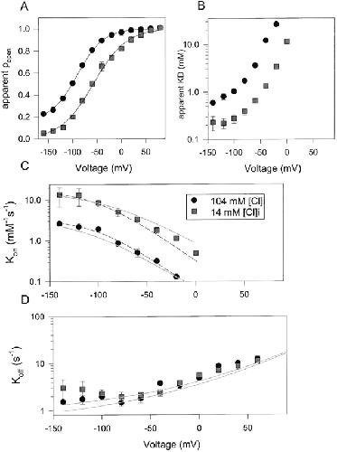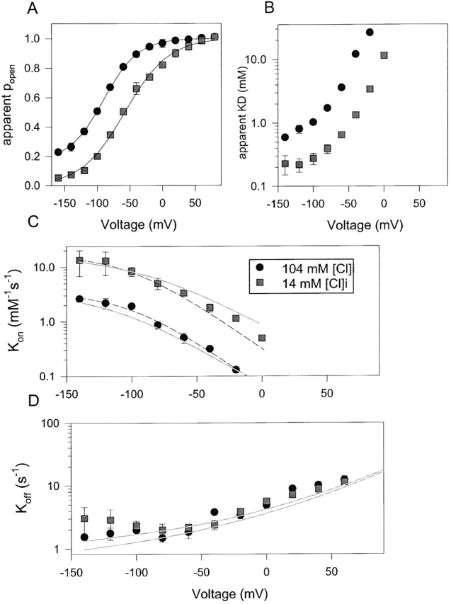 Figure 13. Effect of [Cl]i on the block. [Cl]i was changed from 104 mM (standard solution) to 14 mM (Cl− was replaced by glutamate) on inside-out patches with no or with 1 mM S(−)-CPB present in the intracellular solution. (A) The effect of this maneuver on the apparent open probability in the absence of CPB. The parameters of the fits () are as follows: for high [Cl]i, pmin = 0.16, V1/2 = −90 mV, and z = 0.98; low [Cl]i: pmin = 0.04, V1/2 = −57.8 mV, and z = 0.94. Using the analysis described for normal [Cl] the apparent Kd (B) and the effective on (C) and off (D) rate constants were determined as a function of voltage. The dashed line in C was obtained in the following way: an arbitrary function was fitted to the data in high [Cl]i and the same function was replotted, multiplied by a factor of five. Solid lines in C and D were calculated from a simulation of Fig. 4. The parameters were as in Table .