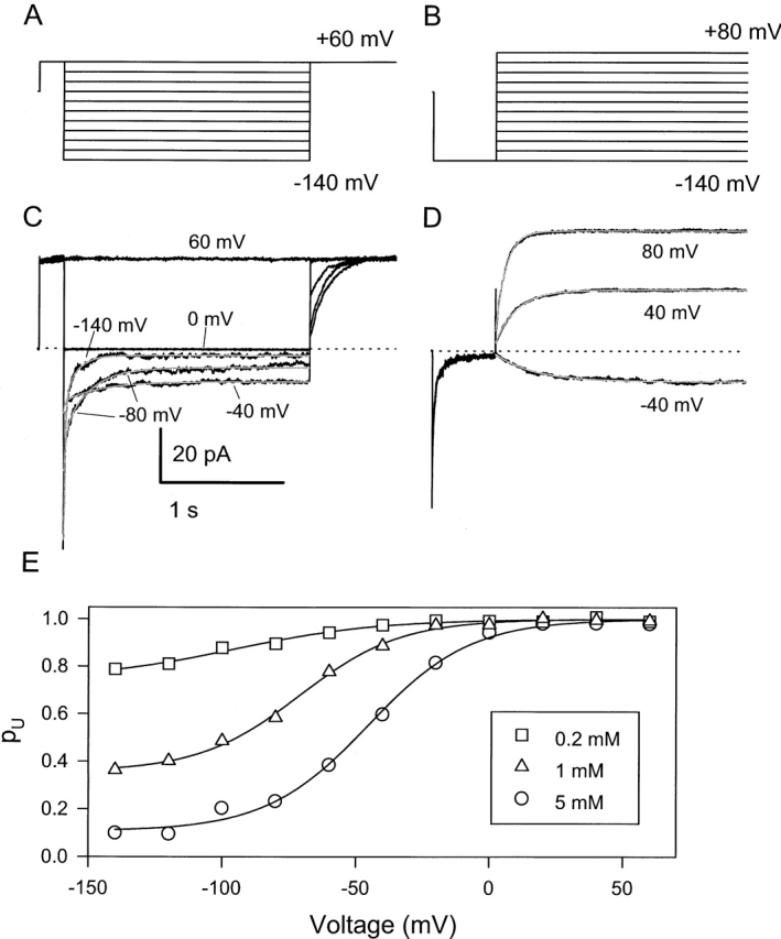 Figure 8. Study of the voltage dependence of CPB-inhibition. Two different pulse protocols are used to study the voltage dependence of on (A) and off (B) CPB inhibition. Recordings obtained from the same patch in 5 mM CPB with protocol A or with protocol B are shown in C and D, respectively. For clarity, only a few current traces are shown at the test voltages indicated. (C) After full removal by the prepulse to +60 mV, the on kinetics and steady-state level of CPB inhibition are measured for various steps to more negative voltages, Vp; the current relaxations at Vp are fitted by double exponential functions (smooth lines) with a fast time constant, τf, very close to that of normal deactivation, and a much larger time constant, τs, reflecting CPB-binding kinetics. At the onset of the following tail pulse to +60 mV, all the noninhibited channels open within ∼1 ms (Accardi and Pusch 2000), yielding an “instantaneous” current proportional to the unbound probability, pU(Vp). (D) After strong inhibition by a prepulse to −140 mV, the conductance increase for various steps to more positive voltages is fitted by a double exponential function for Vp < −60 mV and by a single exponential function for larger Vp's (smooth lines). (E) Shown the pU = punbound values of the same patch shown in C for the single experiment using the pulse data shown in C. pU was calculated as described in the text. The solid lines are fits of , and are shown only for clarity.