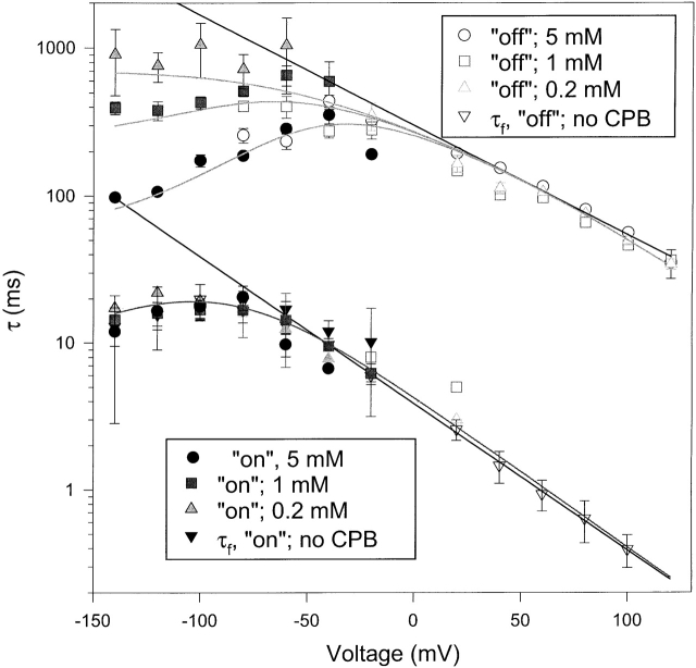 Figure 10. Kinetic analysis of macroscopic currents. Fast and slow time constants, τf and τs, were determined using the pulse protocols described in Fig. 8. Time constants obtained with the protocol of Fig. 8 A (i.e., with a positive prepulse) are indicated as “on” and plotted with filled symbols, whereas time constants obtained with the protocol of Fig. 8 B (i.e., with a negative prepulse) are indicated as “off” and plotted as open symbols. Each point is the mean of at least three determinations and the error bars indicate ±SD. The straight solid lines that fit the slow and the fast time constants in the positive voltage range have a steepness of a apparent gating valence of 0.43 for the slow time constants and a valence of 0.58 for the fast time constant, and illustrates the exponential voltage dependence of the time constants at positive voltages. The dashed lines were obtained by the simulation with Fig. 4 (see materials and methods). The solid line through the fast time constants is the least squares fit of , using and , obtained for β0 = 6.8 s−1, zβ = −0.36.