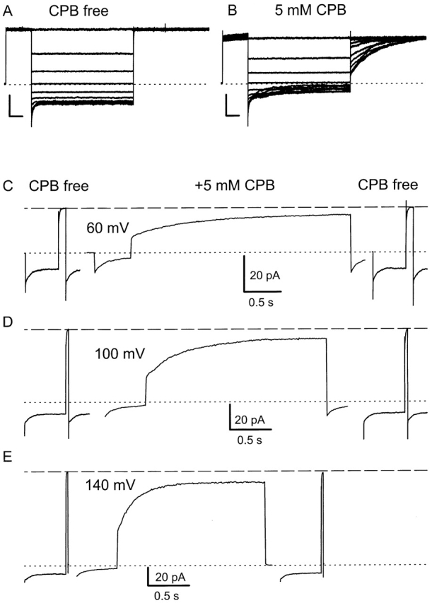 Figure 14. Open channel block of mutant K519E. Example traces of an inside-out patch without CPB (A) and with 5 mM CPB (B). The pulse protocol is as in Fig. 8 C, with longer pulse durations and a constant tail pulse to +60 mV. (C–E) Experiments analogous to those of Fig. 5 in which 5 mM CPB was repeatedly perfused and washed away. Note the incomplete relief from inhibition even at +140 mV. Bars indicate 0.5 s and 20 pA, respectively.