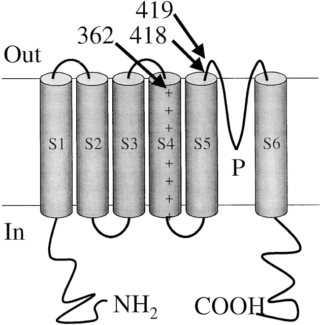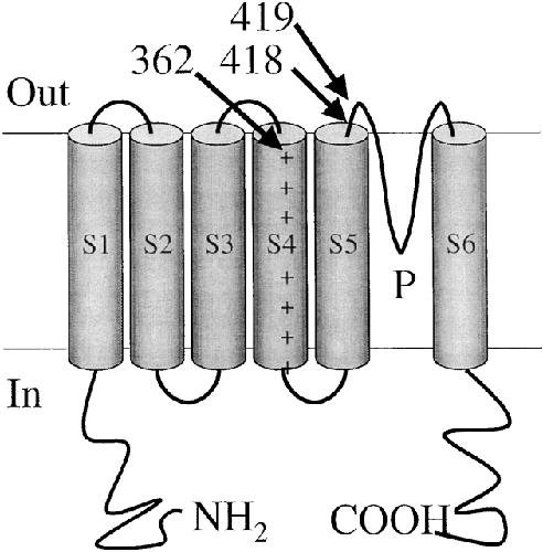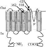 Figure 1. Transmembrane topology of the Shaker K channel. In the present study, we investigate the electrostatic interactions between residue 362 and residues 418 and 419.