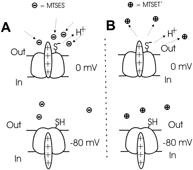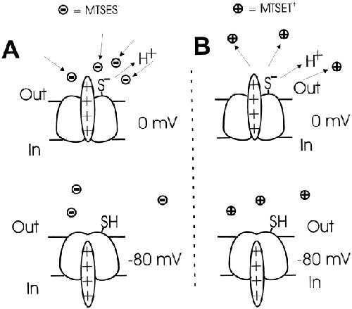 Figure 2. Effect on the local concentration of charged MTS reagents and protonation state of a cysteine due to a change in the local electrostatic potential around the cysteine. (A) The movement of the positive charges of S4 toward the cysteine will increase the local concentration of MTSES− around the cysteine in the open state. The probability of finding the cysteine in the unprotonated reactive state will also increase in the open state. (B) The activation movement of S4 decreases the local concentration of MTSET+ around the cysteine in the open state. But, the probability of finding the cysteine in the unprotonated reactive state will increase in the open state.