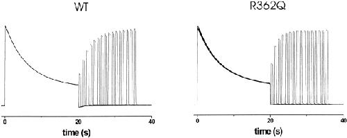 Figure 4. The mutation R362Q does not alter the inactivation kinetics. The voltage is +40 mV during the first 20 s. Then, the membrane voltage is reset to −80 mV for variable times followed by a short voltage pulse to +40 mV. The current scale (ordinate) has been normalized to give equal magnitudes for the initial current peaks for both WT and R362Q.