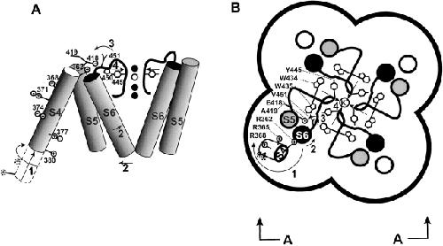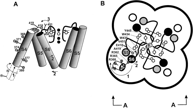 Figure 5. Model of conformational changes during activation and slow inactivation. The structure of the KcsA channel has been used as a template when constructing this cartoon, keeping the distances between residues as in the KcsA channel (Doyle et al. 1998). S4 is shown with solid lines in the activated state and dashed lines in the resting state. (A) Side view (see arrows in B) of the channel (∼20° above the plane of the lipid bilayer). Only two opposite subunits are shown. The K ions in the selectivity filter are the closed circles and the water molecule is open. (B) Extracellular view of the channel. Residues in one subunit are labeled. For simplicity, only S4 in this subunit is shown in its tilted position. Note that the loop from S5 to the center of the channel is only schematically drawn. (1) Upon a positive change in membrane potential S4 moves outward and rotates 180° (Keynes and Elinder 1999). (2) S6 rotates 15° and opens the activation gate (Perozo et al. 1999). (3) Residue 451 rotates toward 418, and 450 is removed from its position in the aromatic cuff (Larsson and Elinder 2000). (4) The aromatic cuff (W434, W435, and Y445) can constrict and the pore is closed at the selectivity filter (backbone of Y445).