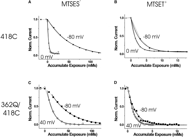 Figure 3. Time course of reaction between MTSES− (A and C) or MTSET+ (B and D) and 418C channels (A and B) or 362Q/418C channels (C and D). Application of MTS reagent in the resting state (closed squares, −80 mV) or the activated state (open circles, 0 mV for 418C, and +40 mV for 362Q/418C). The fitted curves are single exponential curves with time constants in the resting and activated states: (A) 52.3 and 2.8 mMs, (B) 3.0 and 1.5 mMs, (C) 40.4 and 13.2 mMs, and (D) 1.5 and 0.9 mMs.