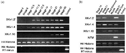 Fig. 5. (A) Developmental expression of XKv1.2â², XKv1.4 and XKv1.10 in whole embryos. cDNA was prepared from whole embryos at stages 2, 8, 10.5,11.5, 12.5, 14, 17, 21, 32 and 50 and XKv1.2â², XKv1.4 and XKv1.10 expression was assessed using specific primers as described in the Materials and methods. (B) Expression of XKv1.2â², XKv1.4 and XKv1.10 in muscle and nerve. cDNA was prepared from the muscle of stage 14 and 21 embryos, adult sartorious muscle and stage 21 spinal cord. Expression of XKv1.2â², XKv1.4 and XKv1.10 RNA was assessed using specific primers as above. Additional RTâPCR with primers specific for medium weight neurofilament (NFM) was carried out to demonstrate that the muscle RNA sample was uncontaminated by nerve. (Controls) RTâPCR with primers for H4 histone was carried out with each of the cDNA preparations as a positive control. The control lane at the right of the figure for the Kv1.2â², Kv1.4, Kv1.10 and H4 reaction contained no template. The H4 primers were used with RT-minus template to ensure there was no genomic DNA and the control lane for this series contained stage 50 cDNA.
