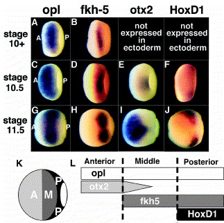 Fig. 2. In situ hybridization reveals the A/P pattern in the presumptive forebrain at stage 10+, and a greater A/P pattern in the ectoderm at stage 11.5. Embryos were analyzed by in situ hybridization (as described in Section 4). All views are dorsal, with anterior to the left. A, anterior; P, posterior. (A) Stage 10+, opl expression. (B) Stage 10+, fkh5 expression. (C) Stage 10.5, opl expression. (D) Stage 10.5, fkh5 expression. (E) Stage 10.5, otx2 expression. (F) Stage 10.5, HoxD1 expression. (G) Stage 11.5, opl expression. (H) Stage 11.5, fkh5 expression. (I) Stage 11.5, otx2 expression. (J) Stage 11.5, HoxD1 expression. (K) Diagram of anterior (A), middle (M) and posterior (P) domains at mid-gastrula. (L) Diagram of gene expression corresponding to A, M, and P domains at mid-gastrula. opl is expressed in all three domains. otx2 expression is primarily restricted to the anterior domain, with lower expression in the midline of the middle domain. fkh5 expression is seen in middle and posterior domains. HoxD1 is expressed in the posterior domain only.