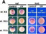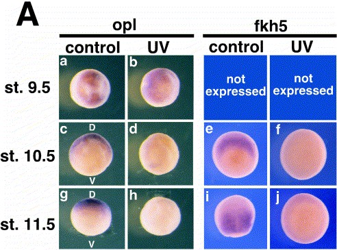 Fig. 5. Expression of opl in the late blastulaectoderm is uniform and UV-insensitive, while dorsal localization of opl and fkh5 in early gastrula is prevented by UV. Whole-mount in situ hybridization is shown for opl in normal embryos or embryos irradiated with UV light during the first cell cycle. In (c,e,g,i) dorsal is towards the top. All views are of the animal hemisphere for opl in situ hybridizations, and of the vegetal pole for fkh5 in situ hybridizations. (a) Expression of opl in control stage 9.5 (late blastula) embryos. (b) Expression of opl at stage 9.5 in embryos treated with UV light during the first cell cycle. (c) Expression of opl in control stage 10.5 (early gastrula) embryos. (d) Expression of opl at stage 10.5 in UV-treated embryos. (e) Expression of fkh5 in control stage 10.5 embryos. (f) Expression of fkh5 at stage 10.5 in UV-treated embryos. (g) Expression of opl in control stage 11.5 (mid-gastrula) embryos. (h) Expression of opl at stage 11.5 in UV-treated embryos. (i) Expression of fkh5 in control stage 11.5 embryos. (j) Expression of fkh5 at stage 11.5 in UV-treated embryos. Expression of opl at stage 9.5 is unaffected by UV treatment, but dorsal localization of opl and fkh5 expression at stage 10.5 and 11.5 is prevented by UV. Embryos harvested at stage 30 equivalent showed that the UV treatment was effective, with all embryos having a dorso-anterior index of 0 or 1 (data not shown). Embryos hybridized to an opl sense probe, as a control for non-specific staining, showed no staining (data not shown).