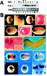 Fig. 1. Expression of fkh5 begins at the onset of gastrulation in posterior dorsal ectoderm, and is subsequently expressed in diencephalon, midbrain, hindbrain, and spinal cord. (A) Northern analysis of fkh5. 1.25 embryo equivalents per lane were analyzed for fkh5 RNA (top row) at various embryonic stages shown. Ethidium stained 18S rRNA is the loading control (bottom row). (B) Whole-mount in situ analysis of fkh5. Embryos were analyzed by in situ hybridization and in some cases sectioned as described in Section 4. Embryo orientations are indicated by: A, anterior; P, posterior. Arrows in (a,c,e) indicate the dorsal lip of the blastopore. (a) Stage 10.5, dorsal view. (b) Stage 10.5, sagittal section, showing fkh5 expression is in non-involuted tissue only. The dotted line indicates the boundary between involuted and non-involuted tissue. (c) Stage 11.5, dorsal view. (d) Stage 11.5, sagittal section, showing fkh5 expression in the dorsal ectoderm only. (e) Stage 13, dorsal view. (f) Stage 13, sagittal section. Bracket indicates fkh5 expression. (g) Stage 19, dorsal view. Arrows in (g) indicate positions of sections in (h,i). (h,i) Coronal sections of stage 19. Brackets indicate fkh5 expression. (j) Stage 27, lateral view. (kân) Double whole-mount in situ hybridizations (as described in Section 4). In all panels, embryos are stage 16â18 embryos, with fkh5 always in purple and opl, otx2 or en2/krox20 in blue. (k) fkh5 and otx2 double in situ, dorsal view. (l) fkh5 and otx2 double in situ, anterior view. Arrows in (k,l) indicate the overlap of fkh5 and otx2. (m) fkh5 and opl, dorsal view. (n) fkh5 and opl, anterior view. (o) fkh5 and en2/krox20 mixed probe, dorsal view. (p) fkh5 and en2/krox20 mixed probe, anterior view. Brackets in (o,p) indicate the partial overlap of fkh5 expression stripes with en2 in the midbrain. The arrowhead indicates partial overlap with the r5 stripe of krox20 expression in the midbrain.