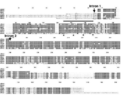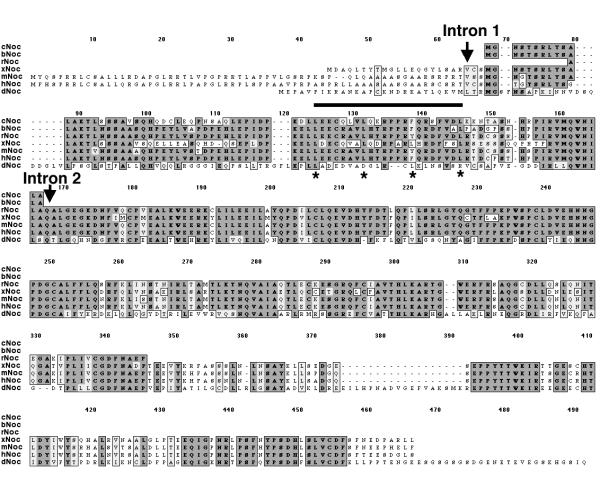 Figure 1. Comparison of the conceptual amino acid sequences of nocturnin homologues from chicken (CNOC), cow (BNOC), rat, (RNOC), Xenopus (XNOC), mouse (MNOC), human (hNoc) and Drosophila (DNOC). Sequences were analyzed using the Clustal W Alignment procedure. Gaps indicated with dots are inserted to achieve optimum alignment. Dark gray and light gray highlights indicate amino acid identities and similarities respectively. The horizontal bar marks the position of the heptad leucine repeat in Xenopus and the asterisks indicate the position of the leucines. The positions of introns 1 and 2 based on the Xenopus gene [36] are indicated by arrows. Note that both mouse [39] and human (from data in public databases of the National Library of Medicine) appear to have a similar gene structure based on 3 exons. The XNOC sequence is from GenBank accession number U74761, HNOC is from NP036250.1 [39], and DNOC is from AAF54601.1 [40]. Our complete mNoc cDNA from retina (accession number AF199491) has the same coding sequence as that reported earlier from liver [38,39]. The cNoc (AF199498), bNoc (AF199497), and rNoc (AF199495) partial sequences are from PCR amplified DNA segments.