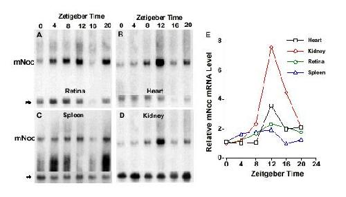 RESULTS: cDNA sequence analysis revealed a high degree of conservation among vertebrate nocturnin/CCR4 homologues along with a possible homologue in Drosophila. Northern analysis of mRNA in C3H/He and C57/Bl6 mice revealed that the mNoc gene is expressed in a broad range of tissues, with greatest abundance in liver, kidney and testis. mNoc is also expressed in multiple brain regions including suprachiasmatic nucleus and pineal gland. Furthermore, mNoc exhibits circadian rhythmicity of mRNA abundance with peak levels at the time of light offset in the retina, spleen, heart, kidney and liver.