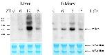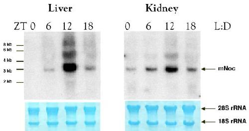 Figure 7. mNoc mRNA is expressed rhythmically in 8 week old BALB/c mouse liver (A) and kidney (B) in a light dark cycle (LD). Tissues for RNA extraction were collected at Zeitgeber Times (ZT) 0 (24), 6, 12 and 18 with lights on at ZT 0 and off at ZT12. Images of the methylene blue stained 28S and 18S rRNA bands on the same blot are shown below as loading controls.