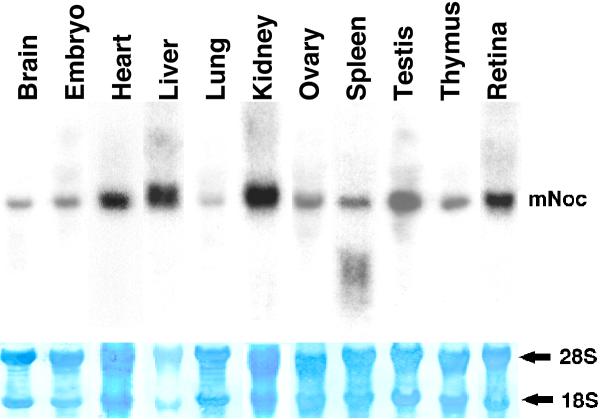 Figure 2. mNoc mRNA is expressed in multiple tissues of the C3H/He mouse. Tissues for RNA extraction were collected at Zeitgeber Time (ZT) 12 (time of normal light offset) except for that from embryo and thymus, which were purchased from Ambion (Austin, TX); the latter samples were from Swiss mice. Ten μg of total RNA was loaded in each lane except for liver where only 5 μg was loaded. The lower panel shows methylene blue staining of the 28 and 18s ribosomal RNA bands after blotting.