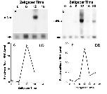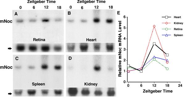 Figure 3. mNoc mRNA is expressed rhythmically in C3H/He mouse retina (A), heart (B), spleen (C), and kidney (D) in a light dark cycle (LD). Tissues for RNA extraction were collected at Zeitgeber Times (ZT) 0 (24), 6, 12 and 18 with lights on at ZT 0 and off at ZT12. A through D are typical blots of mNoc for each tissue, and the lower panel is a hybridization of the same membrane with a β-actin probe. These blots are representative of three replicate experiments. In E phosphor imaging was used for quantitation of changes in mNoc mRNA level seen in A-D, standardized to β-actin. The minimum for each plot is one and the Y-axis shows the fold change.