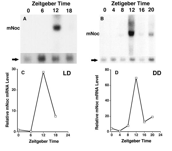 Figure 4. mNoc mRNA in liver exhibits a high amplitude rhythm with peak expression at ZT12 in both LD (A and C) and DD (B and D). In LD samples were taken at 6 hour intervals as in Figure 4. Samples in DD were taken at Zeitgeber Times (ZT) 0 (24), 4, 8, 12, 16 and 20 referenced to the LD cycle immediately before DD treatment. Mice were in DD for 36 hours before beginning collections. The rhythmic changes illustrated are representative of three replicates for LD and two for DD. Phosphor imaging was used as in Figure 4E to quantitate mNoc mRNA levels (C and D). Note that the amplitudes of the rhythms are much higher in liver than for other tissues.