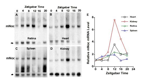 Figure 5. mNoc mRNA is expressed rhythmically in C3H/He mouse retina (A), heart (B), spleen (C), and kidney (D) in constant darkness (DD). Tissues for RNA extraction were taken in DD at Zeitgeber Times (ZT) 0 (24), 4, 8, 12, 16 and 20 referenced to the LD cycle immediately before DD treatment. Mice were in DD for 36 hours before beginning collections. Note that for most tissues the RNA yield was low at ZT16 for technical reasons; the lower actin signal is taken into account in the quantitation. The rhythmic changes illustrated are representative of two replicate experiments. In E, phosphor imaging was used for quantitation of the changes seen in A-D, standardized to β-actin; the minimum for each plot is one and the Y-axis shows the fold change.