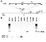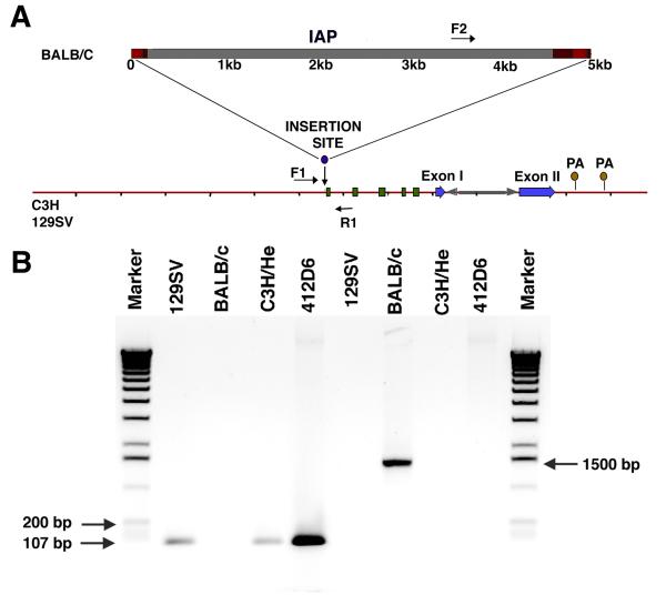 Figure 6. C3H/He and 129/SV mice lack an intracisternal A-particle (IAP) insert in the first intron of the nocturnin/CCR4 gene. A. Diagram showing the results of partial sequencing of a nocturnin genomic clone derived from a 129/SV bacterial artificial chromosome (BAC) library. Green boxes identify regions of medium repetitive sequences in the mouse genome. The blue arrows represent mNoc coding regions corresponding to Xenopus exons II and III separated by an intron. The IAP element identified in BALB/c mice (bar above) was expected between bp 6583 and 6584 in our BAC sequence based on published data [39] but was lacking in this BAC sequence. F1, F2 and R1 are the positions of forward and reverse primers used for genomic PCR. Note that there are two potential polyadenylation sites in the 3' UTR 650 base pairs apart. The 3' UTR probe used in our northern analysis lies between the two potential polyadenylation sites, and hybridizes to the same mRNA band as the probe derived from Exon II. This suggests that only the most 3' site is used. B. Genomic PCR with primers from the BAC clone flanking the IAP site (labeled as F1 and R1 in A) resulted in a 107 bp band in C3H/He and 129SV mice that was lacking in BALB/c mice. Pairing the R1 primer from the BAC clone with primer F2 derived from the IAP sequence (see A) resulted in a 1500 bp band in BALB/c mice but not 129SV or C3H/He. DNA sequencing revealed the expected sequence from the BAC clone for the 107 bp band and the expected sequence from the IAP insert for the 1500 bp band. The lanes labeled 412D6 are control PCR reactions using the 129/SV BAC as template. Note that the absence of ≅ 5 Kb band for BALB/c mice with primers F1 and R1 is due to the inefficiency of Taq polymerase for large products; we have separately obtained the full IAP insert in BALB/c mice using a long PCR procedure. DNA size markers are included in the two outer lanes.