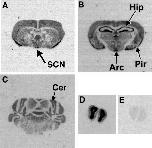 Figure 8. In situ hybridization of coronal sections through the mouse brain shows that mNoc is expressed in multiple brain regions. A. Section showing intense hybridization of an antisense probe in the suprachiasmatic nucleus (SCN). B. Section showing hybridization in the arcuate nucleus (ARC), piriform cortex (Pir), and hippocampus (Hip). C. Section showing hybridization in the cerebellum.D. Section showing intense hybridization in the olfactory bulbs. E. Section through the olfactory bulbs showing lack of hybridization of a sense probe.