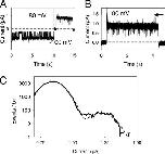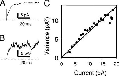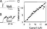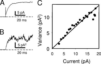 Figure 1. Nonstationary noise analysis of mutant E166D at 120 mV. The figure shows the results from a typical inside-out patch containing many E166D channels. Currents were repeatedly activated at 120 mV (activation time constant ∼6 ms) and the mean was calculated (A). The variance was calculated from the mean square difference of consecutive records (Heinemann and Conti, 1992) (B). In C the variance (binned) is plotted versus the mean current (symbols) together with a fit of Eq. 1 (line) with the particular parameters i = 0.70 pA, N = 103.