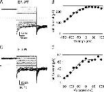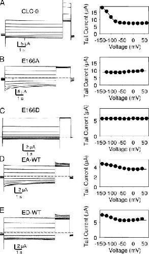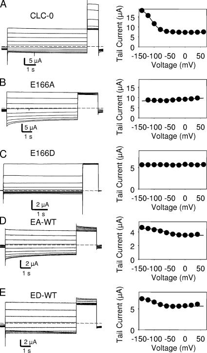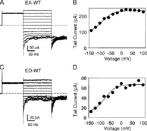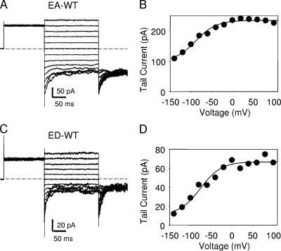 Figure 3. Fast gate of heterodimers. Representative inside-out patch recordings are shown for the EA-WT (A) and the ED-WT (B) dimer. The degree of activation of the fast gate is monitored as the initial current at the constant −140 mV tail pulse, plotted as absolute values in B and D, respectively. The solid lines in B and D represent fits of the equation I(V) = Imax (pmin + (1 − pmin)/(1 + exp((V − V1/2)/k))) with the parameters pmin = 0.42, V1/2 = −89 mV, k = 25 mV for EA-WT; and pmin = 0.16, V1/2 = −75 mV, k = 25 mV for ED-WT. The popen(V) curve of the EA-WT dimer is very similar to that described for WT CLC-0 under identical conditions (Accardi and Pusch, 2003). Similar results were obtained in at least three patches for each kind of tandem dimer.