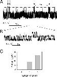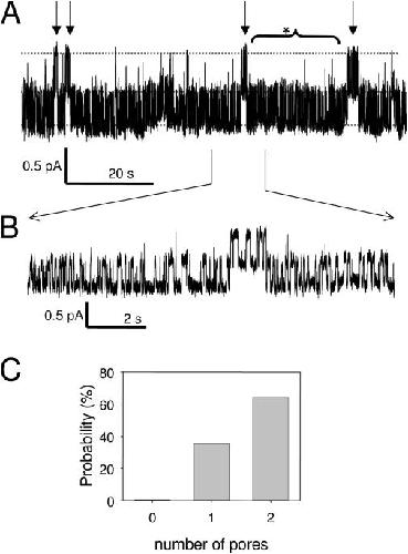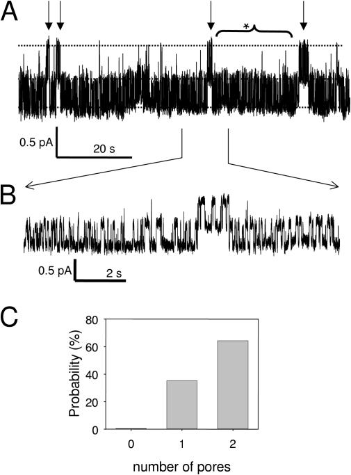 Figure 4. Single channel phenotype of EA-WT dimer. In A, a recording at −100 mV of a patch containing a single EA-WT dimer is shown. Three conductance levels can be seen (dashed lines) corresponding to the baseline (both pores closed), one pore open, and two pores open. The behavior can be well described by the superposition of a WT pore with relatively fast gating and a popen around 0.64 and a pore that is mostly open with occasional longer closures (see arrows in A). The fast gating is better seen in B, which shows part of the upper trace at an expanded time scale. C shows the relative areas obtained by fitting the sum of three Gaussian functions to the amplitude histogram obtained over the stretch marked with the bracket with asterisk in A. In this period, no long closure event is seen and the area of the level 2 peak is 64% of the total area whereas the baseline peak is <1%. Similar results were seen in a total of four single-channel patches (one patch WT-EA, three patches EA-WT).