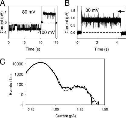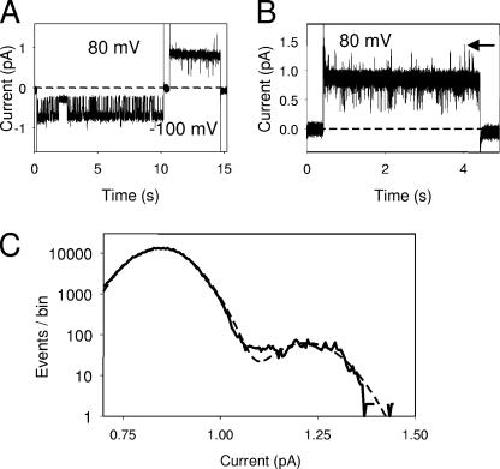 Figure 5. Phenotype of dimer WT-ED. In A, a current trace recorded from a patch with a single WT-ED dimer is shown. The voltage was stepped from 0 to −100 mV, back to 0 mV for a brief time and then to 80 mV. Currents appear almost like a single WT pore at −100 mV (with a popen ∼ 0.7) and at 80 mV with a popen of almost 1. However, brief openings to a second open level are visible at 80 mV. To visualize the “spikes” at 80 mV, B shows the superposition of 10 consecutive records at an expanded time scale showing only the pulse to 80 mV. To quantify the popen of the ED pore on top of the WT pore at 80 mV, the amplitude histogram of all records at 80 mV was constructed and limited to the part I > 0.7 pA (C, solid line). In this way, interferences from short closures were eliminated. The amplitude histogram was fitted by the sum of two Gaussian functions (dashed line in C). Since the popen of the WT pore is close to one, the relative area of the higher peak directly reflects the popen of the ED pore. In this case it amounts to 0.51%. Similar results were seen in a total of six single-channel patches (two patches WT-ED, four patches ED-WT)