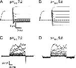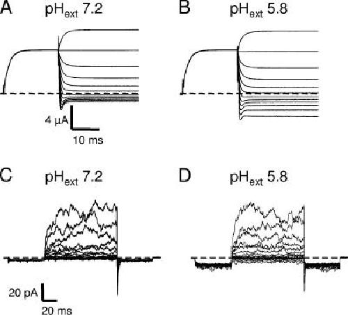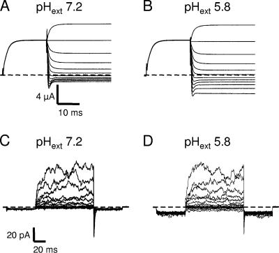 Figure 6. Dependence of E166D on the extracellular pH. (A and B) Two-electrode voltage clamp recordings from the same oocyte at pHext 7.2 (A) and pHext 5.8 (B). The pulse protocol consisted of a prepulse to 60 mV followed by pulse to a variable voltage (from 80 to −140 mV). (C and D) Recordings from an outside out patch perfused with an extracellular solution at pH 7.2 (C) and 5.8 (D). The pulse protocol consisted of a prepulse to −140 mV followed by pulse to a variable voltage (from 160 to −140 mV) and a final tail pulse to −140 mV.