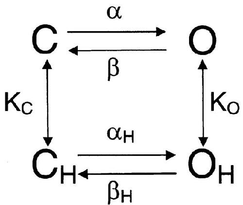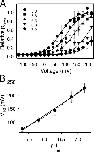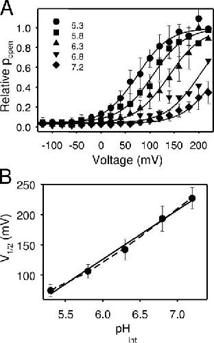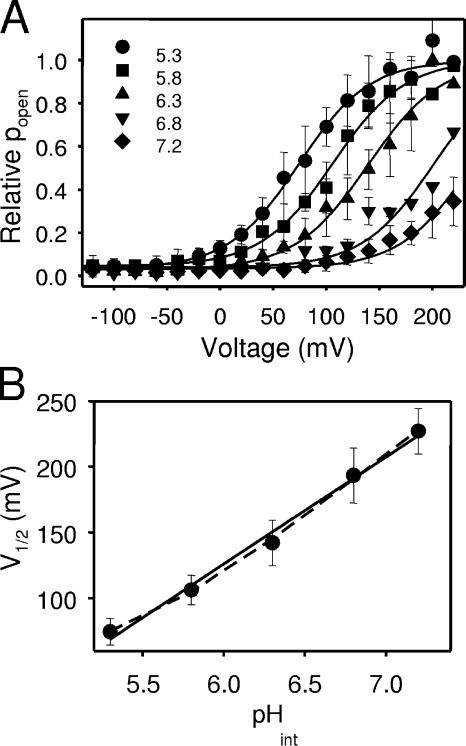 Figure 8. Analysis of the pHint dependence of E166D for pH > 5. (A) Averaged relative popen obtained from the tail currents as explained in the text are plotted versus voltage for each pHint with symbols as indicated. Error bars indicate SD. The solid lines represent fits of Eq. 2. The “slope” parameter, k, was ∼33 mV for pHint 5.3, 5.6, and 6.3, whereas it was manually fixed to 34 mV for pHint 6.8 and 7.2. (B) Average V1/2 values obtained from fits of the individual experiments plotted versus the respective pHint value (error bars are SD). The solid line is a linear fit with a slope of 81 mV per pH unit. The dashed line is a fit of Eq. 5 resulting in K1(0) = 4.3*10−8, pKO = 12.2, pKC = 5.3, z = 0.59.