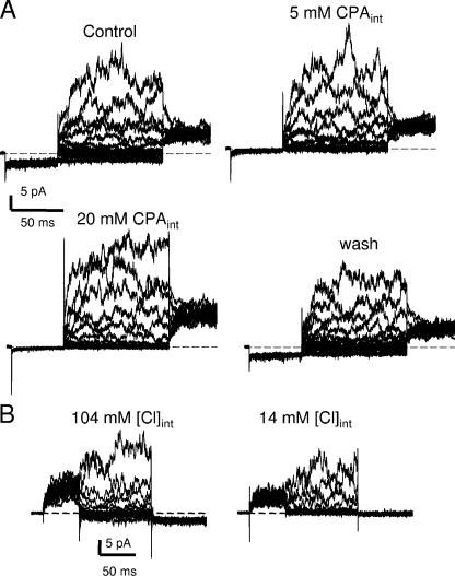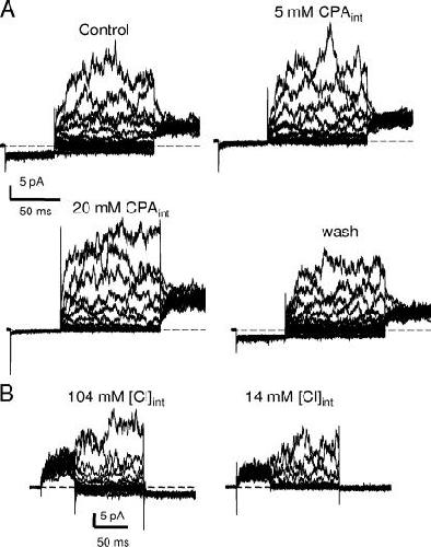Figure 9. Proof of specificity of the persistent inward current. (A) Currents recorded from an inside-out patch containing many E166D channels in control, in the presence of 5 and 20 mM CPA in the intracellular solution and after washout. The pulse protocol consisted of a prepulse to −140 mV, a variable pulse to voltages from −140 to 160 mV and a constant tail pulse to 100 mV. Note the block of inward currents by CPA. The slight increase of outward currents by CPA was observed consistently, but was not analyzed in detail. (B) Current traces from an inside-out patch with 104 mM Cl− inside (left) and 14 mM Cl− inside (right). Intracellular and extracellular pH had standard values in these experiments.