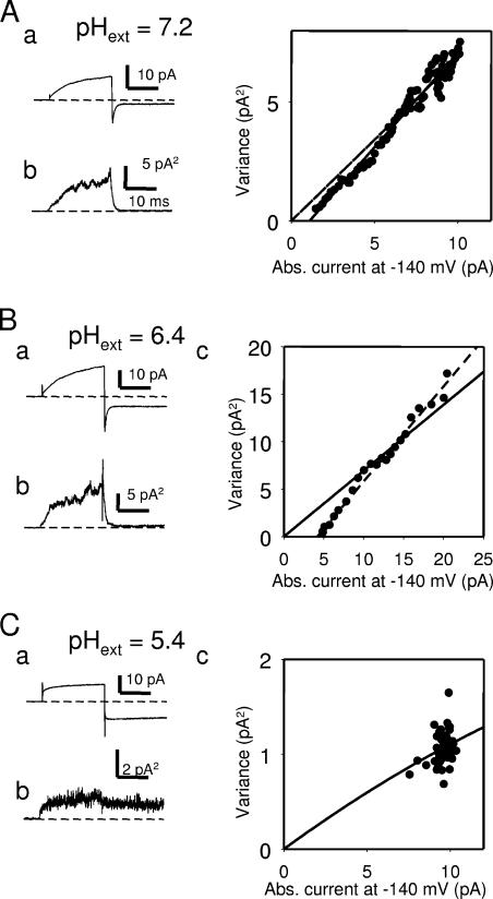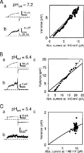 Figure 10. Small unitary conductance underlying the persistent current. In each box (A–C) are shown the results of a nonstationary noise analysis conducted with an inside-out patch with the indicated pHext values. In each case, subpanel a shows the mean current response from >60 stimulations evoked by a step from 0 to 160 mV and then to −140 mV. Subpanel b shows the corresponding baseline-subtracted variance. Subpanel c shows the plot of the binned variance versus the absolute value of the mean for the segment of the records at −140 mV. Solid lines are best fits of Eq. 1 with i = 0.68 pA (A), i = 0.7 pA (B), i = 0.13 pA (C). The number of channels was very large in A and B, and N = 583 in C. The dashed lines in A and B are linear fits with slopes of 0.79 pA (A) and 1 pA (B) and a current offset of 1.1 pA (A) and 4.2 pA (B). The residual variance at the end of the −140 mV pulse was 0.46 pA2 in B.
