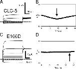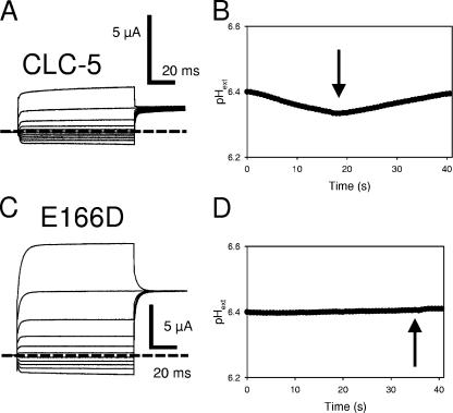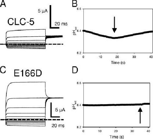Figure 11. Persistent inward current is not associated with H+ inward movement. The extracellular pH was measured with a pH-sensitive microelectrode close to the oocyte surface as described in MATERIALS AND METHODS. Currents recorded from a CLC-5–expressing oocyte are shown in A (pulses are from −120 to 80 mV with a constant “tail” pulse to 60 mV). In B, the pH response, shown as a function of time, was evoked by a train of 300-ms pulses to 60 mV (current at 60 mV is ∼1.8 μA) with a 300-ms holding period between the pulses at −20 mV. The arrow indicates the switch off of the voltage clamp, nulling the current and leading to a recovery of pHext. (C and D) Results from a similar experiment from an oocyte from the same batch expressing mutant E166D. The train of 300-ms pulses was delivered to −100 mV (Vhold = −30 mV), where a current of ∼−2 μA was measured. No significant pH change could be detected in >10 oocytes with large expression of E166D, whereas a pH change was robustly detected in all CLC-5–expressing oocytes.