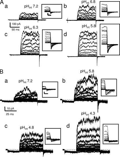 Figure 7. Dependence of E166D on the intracellular pH. (A) Families of current traces recorded from the same inside-out patch at the indicated pHint values. The pulse protocol consisted of a prepulse to −140 mV followed by pulse to a variable voltage (from 220 to −140 mV) and a final tail pulse to −140 mV that served to estimate the open probability as explained in the text. The boxed insets show on a magnified time scale the initial phase of the deactivation at the final tail pulse to −140 mV (horizontal scale bar in inset, 1 ms; vertical scale bar, 30 pA; all insets are drawn at the same scale). Experiments from a different patch are shown in B at the indicated pHint values (scale bars in inset, 1 ms and 10 pA, respectively). Voltage pulses in B were from 180 to −140 mV.