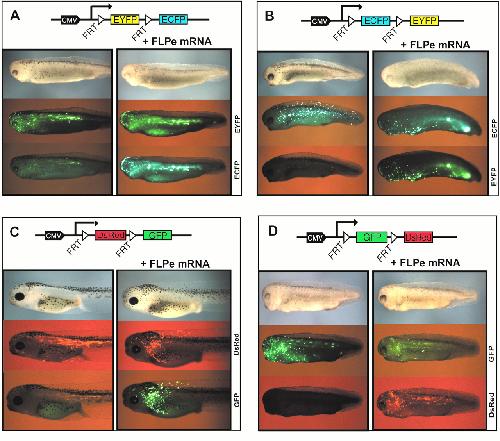 Figure 3. FLP reporters encoding different fluorescent proteins. The FLP inducible reporters CMV:EYFP(FRT)ECFP (A), CMV:ECFP(FRT)EYFP (B), CMV:DsRed(FRT)GFP (C) and CMV:GFP(FRT)DsRed (D) are schematically drawn in each panel. Xenopus larvae were derived from eggs injected with reporter DNA (left panels) or coinjected with reporter DNA and FLPe mRNA (right panels). The living larvae were photographed in normal light (top picture in each panel) or in fluorescence light using defined filter sets (middle and bottom picture in each panel). The excitation/barrier filters were 480/510 nm for EYFP and GFP, 425/475 nm for ECFP and 546/590 nm for DsRed.